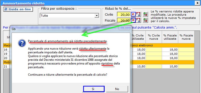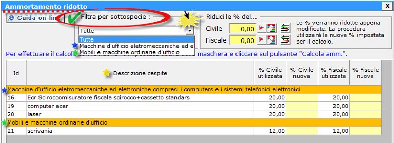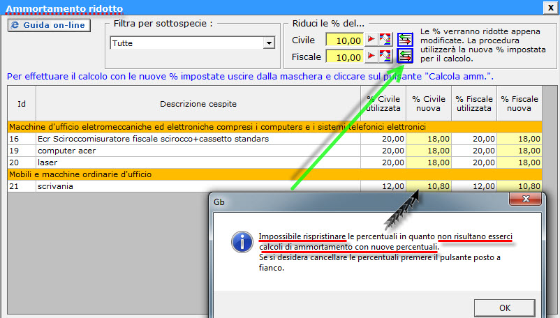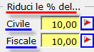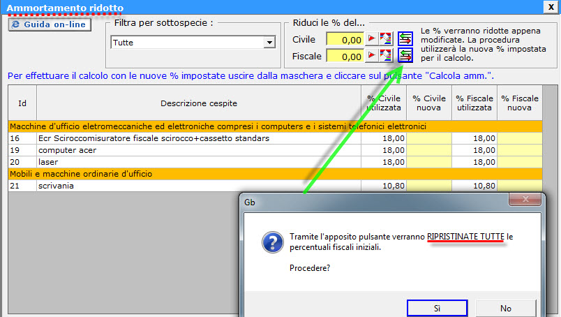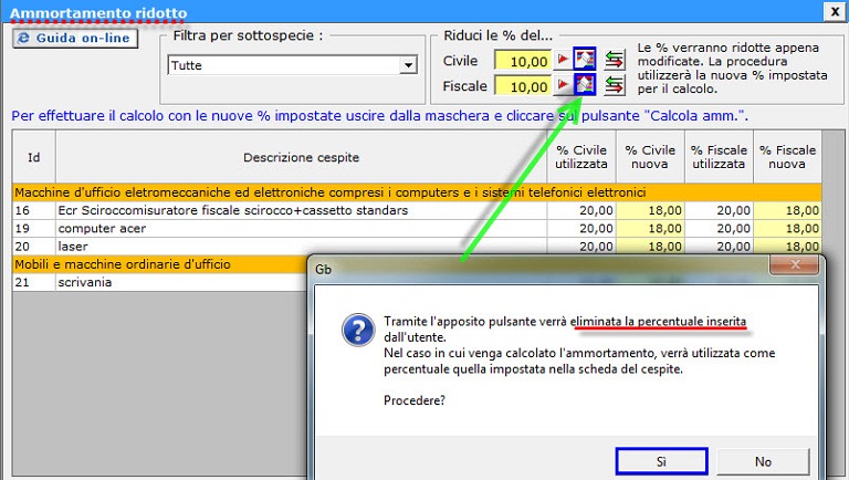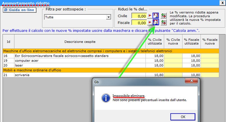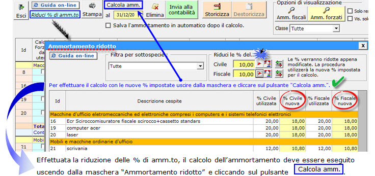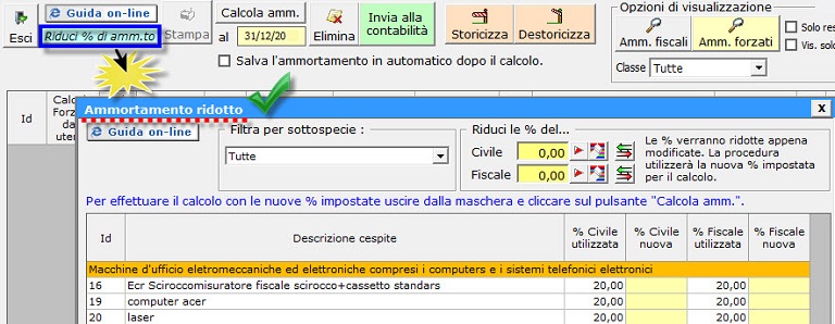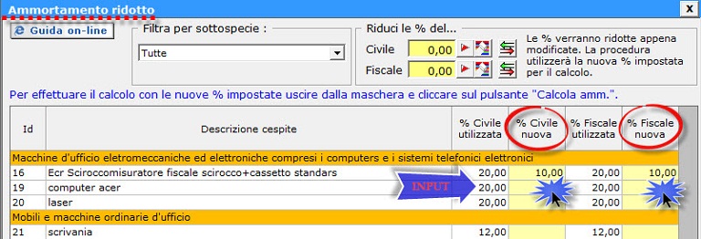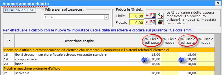 – tramite il calcolo automatico “Riduci le % Civili e Fiscali del …” : inserendo la % di riduzione di amm.to nello spazio giallo