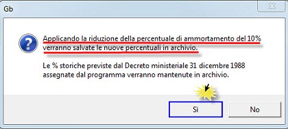 Nel caso in cui l’utente rientra nella maschera dell’ammortamento ridotto e procede ad una nuova riduzione della percentuale di ammortamento, GBsoftware, avverte tramite messaggio