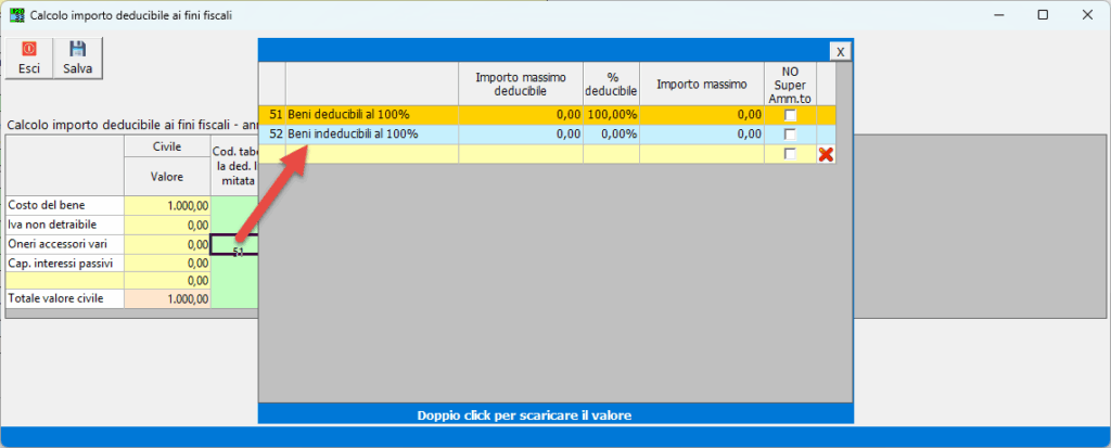All’uscita dalla form si apre la maschera “Calcolo importo deducibile ai fini fiscali”: