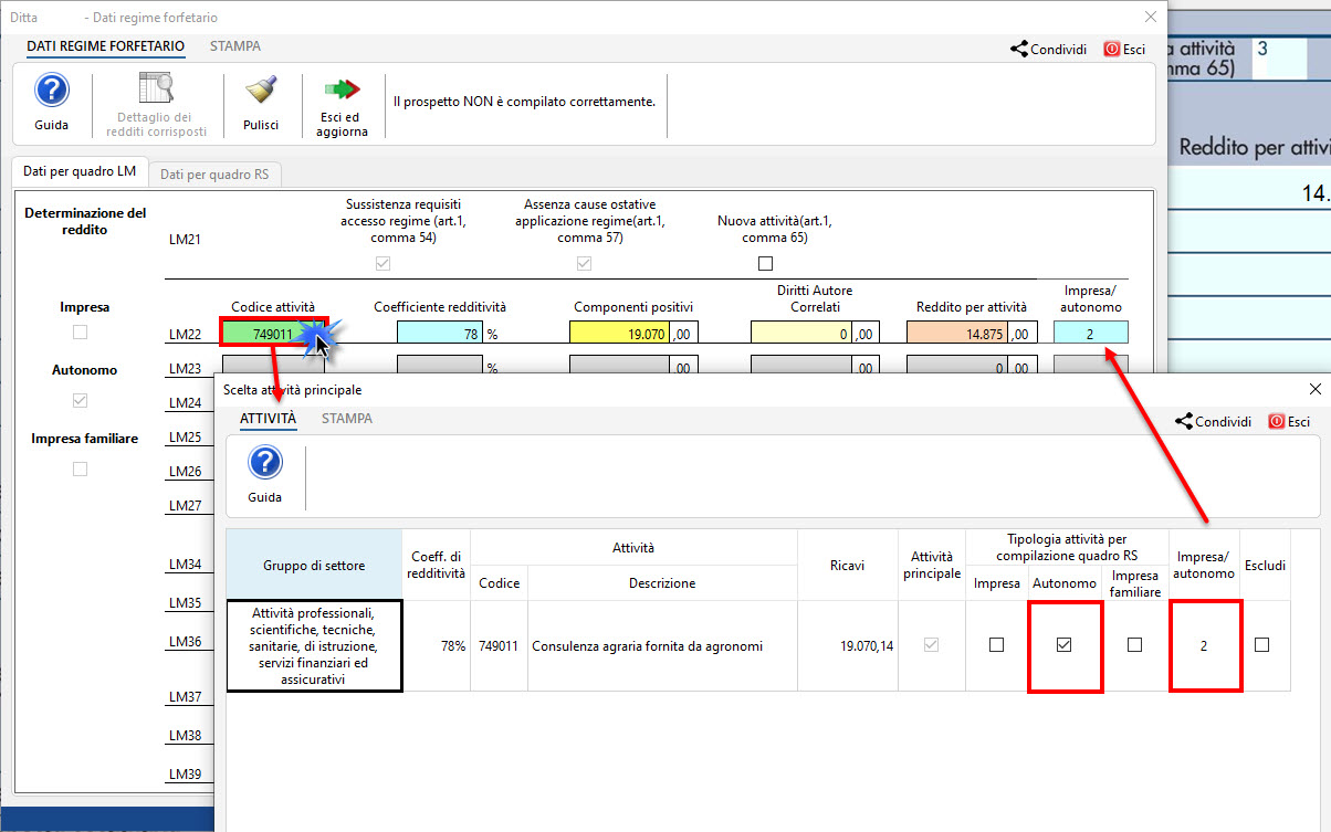 La compilazione della colonna “Impresa/autonomo” è gestita dal software nella maschera che si apre con doppio click nel campo “codice attività”: