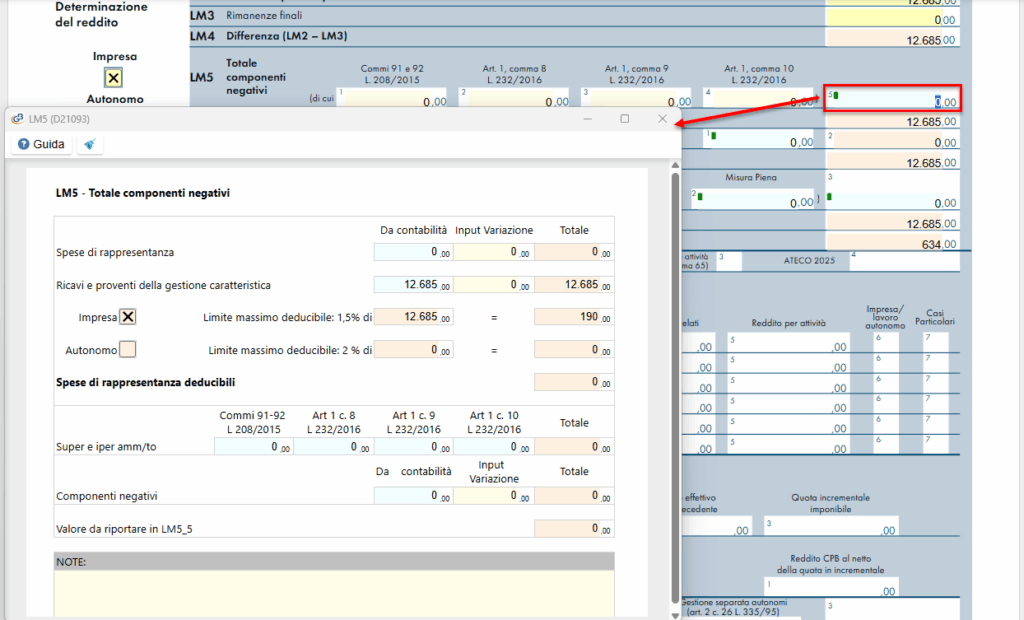 Nella presente gestione, oltre alle spese, è calcolata la deducibilità delle spese di rappresentanza registrate in contabilità. Il limite massimo deducibile viene calcolato sull’1,5% dei ricavi della gestione caratteristica, se il soggetto è impresa – impresa familiare; sul 2% dei ricavi in caso di lavoratore autonomo.
