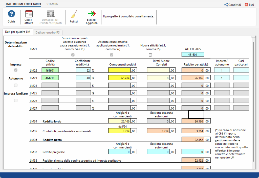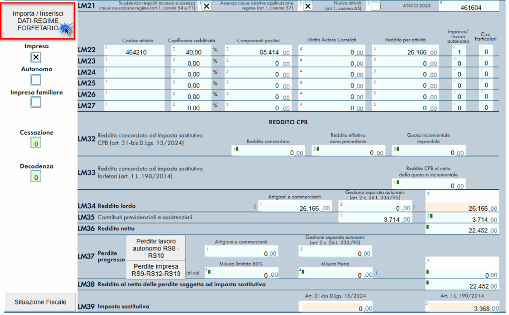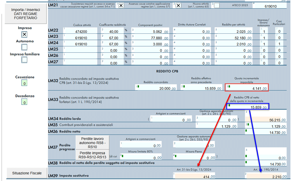 - LM33 dove indica il reddito concordato su cui sarà calcolata l’imposta sostitutiva del regime forfetario.