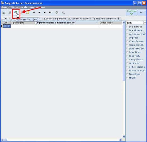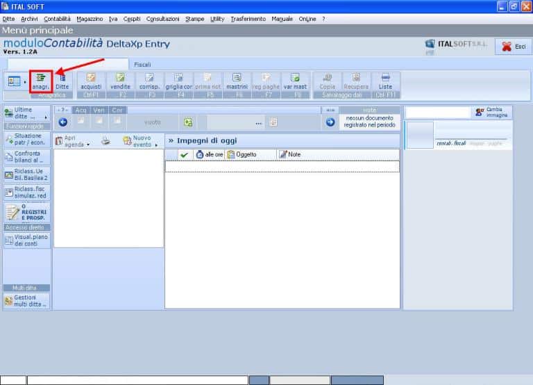 Per poter esportare un file di testo contenente i dati delle ditte è necessario accedere al programma ItalSoft – DeltaXp, sulla parte della contabilità e cliccare sul menu il pulsante "anagr." sulla sezione dell’Anagrafica.