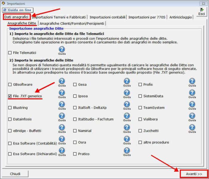 Per procedere cliccare sulla cartella "Dati anagrafici" e successivamente sulla sottocartella "Anagrafiche Ditte", di seguito selezionare, al punto "2) Importa le anagrafiche delle Ditte", l’opzione "da File .TXT generico" e cliccare su "Avanti".