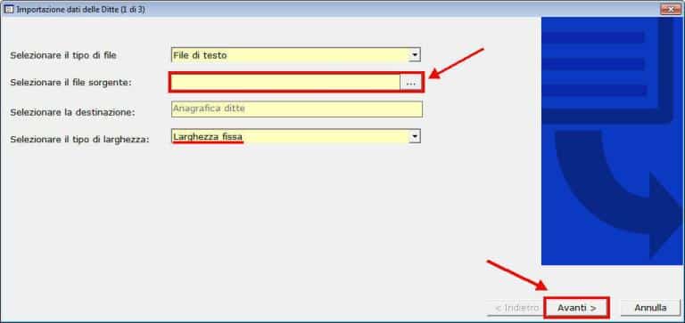 Successivamente è fondamentale selezionare il file sorgente che contiene i dati delle ditte che si vogliono importare e impostare il tipo di larghezza a larghezza fissa, poi premere Avanti.