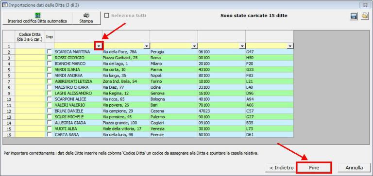 Nell’ultimo passaggio, dovremo inserire l’intestazione per ogni colonna, inserire il codice Ditta per ogni riga che può essere inserito o manualmente oppure cliccando sul pulsante , andare a selezionare le Ditte che si vogliono importare e cliccare su Fine.