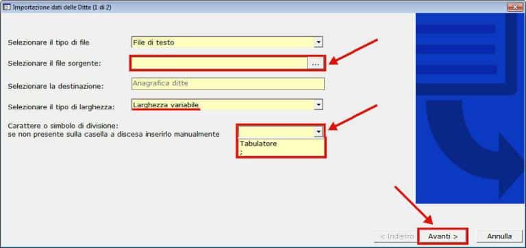 Successivamente è fondamentale selezionare il file sorgente che contiene i dati delle ditte che si vogliono importare e definire la tipologia dell’importazione in base al formato del file, cioè a larghezza variabile e carattere di divisione tabulatore semplicemente selezionandolo dalla casella a discesa.