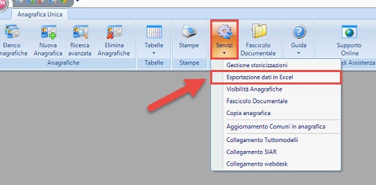All’interno dell’applicazione Anagrafica Unica, selezionare Esportazione dati in Excel che si trova nell’utility Servizi.