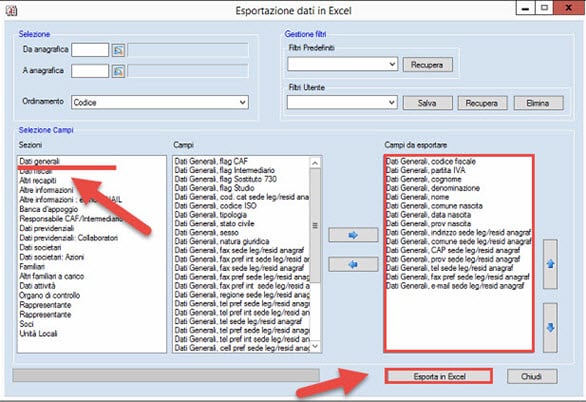 Nella maschera che si aprirà, potremo selezionare i dati da esportare. Quindi selezionare la sezione Dati Generali e scegliere i campi come nell’immagine.