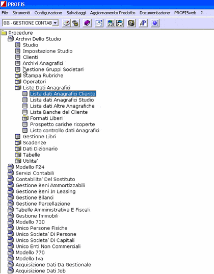 Dal menu principale del gestionale Profis espandere la voce Procedure, poi Archivi dello studio Liste dati anagrafici. Infine cliccare su Lista dati Anagrafici Cliente.