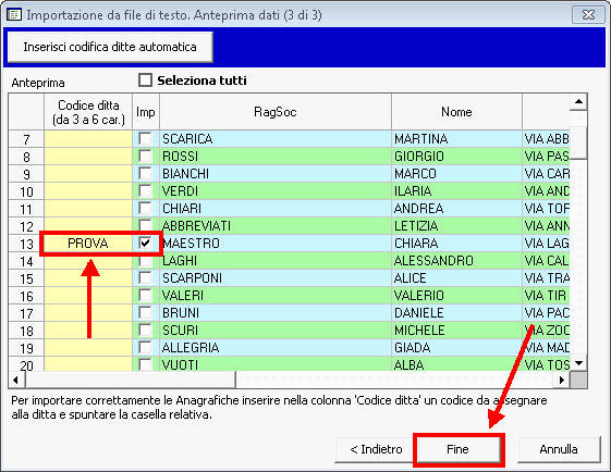 Selezionare Fine per importare le anagrafiche scelte.