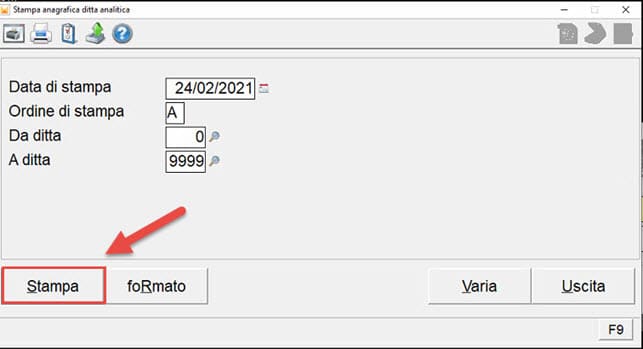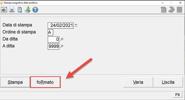 Nella finestra Stampa anagrafica ditta analitica , entrare in Formato.