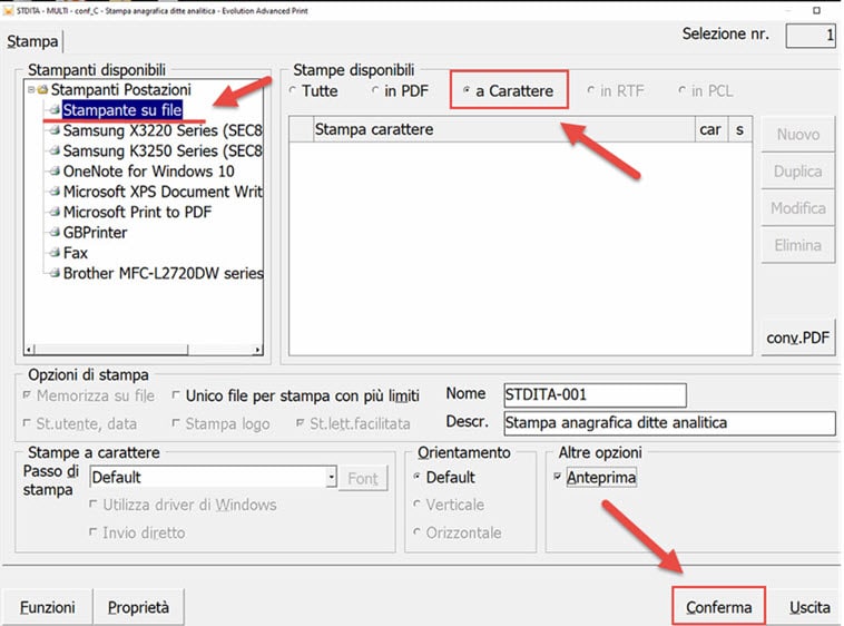 Nella finestra Stampanti disponibili selezionare Stampante su su file, a Carattere confermare..
