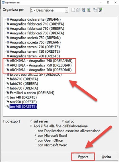 Dalla maschera di scelta Esportazione dati, è possibile scegliere a seconda delle esigenze, quale anagrafica esportare. Scegliere quindi uno fra ARCHIVIA -Anagrafica 740 , ARCHIVIA -Anagrafica 750 , ARCHIVIA -Anagrafica 760.