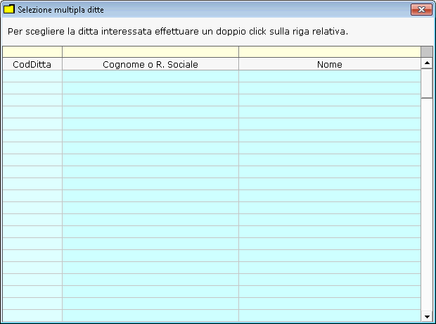 N.B.: Nel caso in cui la prima colonna "CodDitta" si presenti di colore rosso, questo sta a significare che nell’elenco delle anagrafiche sono presenti due ditte con lo stesso codice fiscale, per caricare la giusta ditta desiderata cliccare sul pulsante nella seconda colonna.