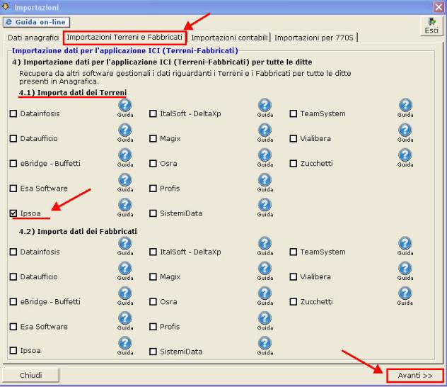 Per procedere cliccare sulla cartella "Importazioni dati per dichiarativi", di seguito selezionare, al punto "4.3) Importa dati dei Terreni", l’opzione "Importa dati dei Terreni da Ipsoa" e cliccare su "Avanti".