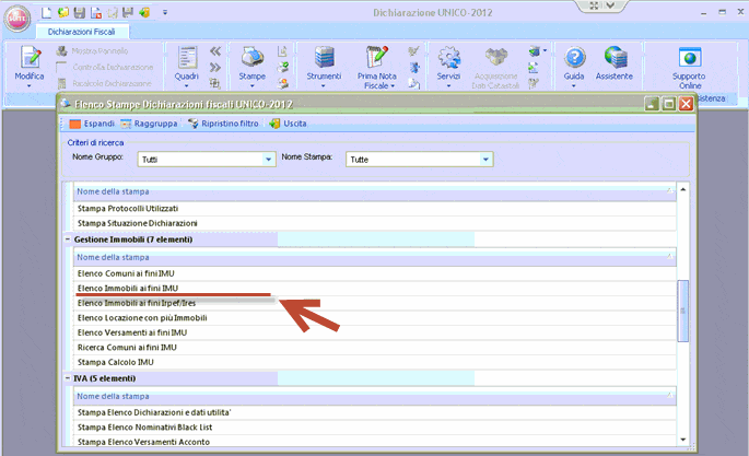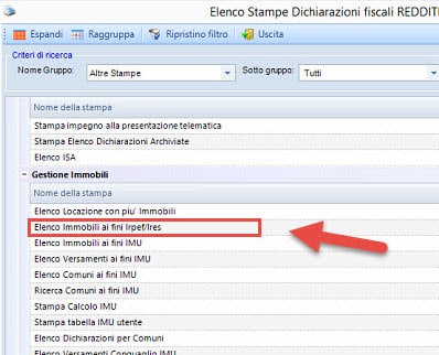Dalla finestra aperta, selezionare Elenco immobili ai fini IMU oppure Elenco immobili ai fini Irpef/Ires.