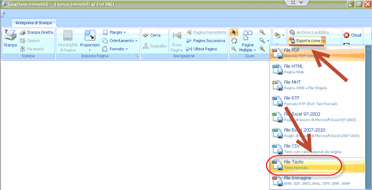 Nell’anteprima di stampa, cliccare in alto a destra in "Esporta Come" e selezionare "File Testo"