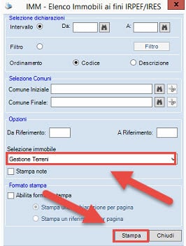 Da "Selezione Immobile" scegliere "Terreni" e successivamente cliccare "Stampa".