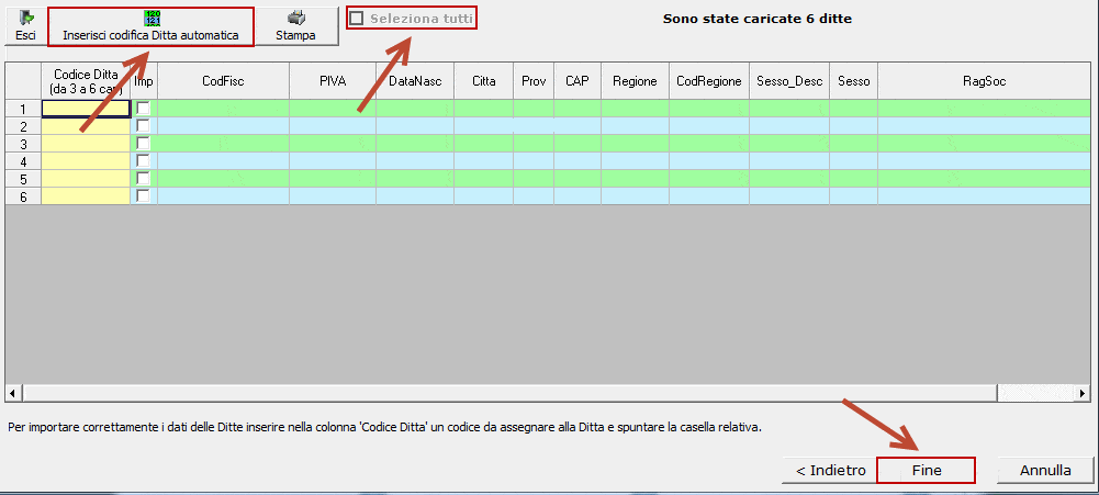Per inserire tutti i codici ditta automaticamente cliccare sul pulsante ‘Inserisci codifica ditte automaticamente’ e sul campo Codice ditta verranno inseriti dei codici numerici progressivi e, ceccando la casella ‘Seleziona tutti’, verranno selezionate tutte le caselle nella colonna ‘Imp’ dove sono stati inseriti i codici automaticamente.
